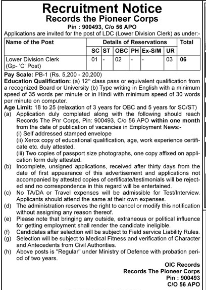 C/O 56 APO (C/O 56 APO) Has Released Recruitment Notification For 06 Lower Division Clerk Posts. All Eligible And Interested Candidates Can Apply Offline On Or Before 01-09-2014 (1st September 2014). Further Detailed Information Regarding Educational Qualifications, Age Limit, Selection Procedure, Exam Pattern, Syllabus for C/O 56 APO (C/O 56 APO) Recruitment 2014 - 06 Lower Division Clerk Post is mentioned below